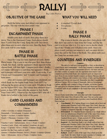 Rally! is a wargame played entirely with just a 52-card playing deck and a coin. Draw your men from the mercenary camp and build a strong force of five ranks to repel the opponent.